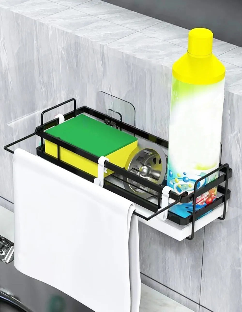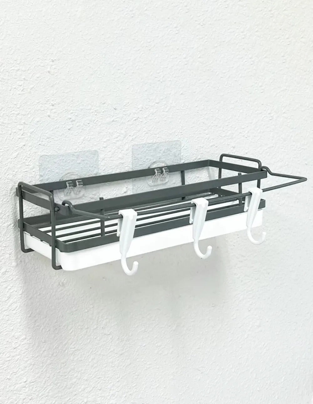 Incluye 3 ganchos móviles para colgar accesorios, paños o esponjas, y un sistema de fijación adhesiva que evita perforaciones.